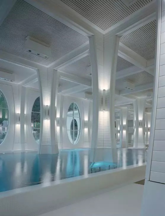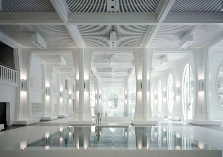 溫泉浴場(chǎng)屬于大酒店的一部分,因此文化和審美具有傳統(tǒng)上的同一性:放松,親和。建筑非常具象,就是一個(gè)地道的建筑物,內(nèi)部用涂成白色的木材替代“城市”中的石柱子。同時(shí)建筑顯眼的橢圓形窗口讓景觀(guān)更優(yōu)縱深感,并充滿(mǎn)了維多利亞時(shí)代感,這算是對(duì)環(huán)境景觀(guān)應(yīng)對(duì)的一個(gè)中立性態(tài)度。