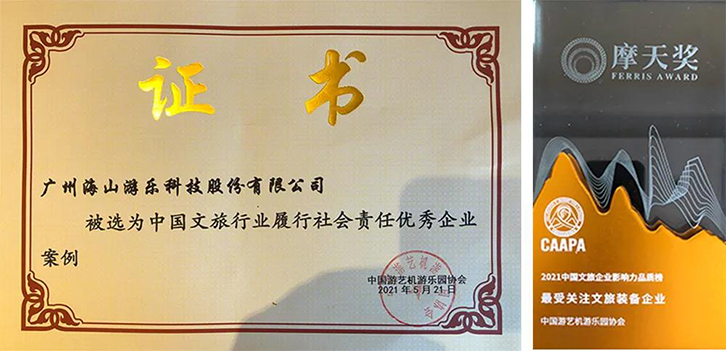 廣州海山評選為“中國文旅行業(yè)履行社會責(zé)任優(yōu)秀企業(yè)案例”和“最受關(guān)注文旅裝備企業(yè)”。
